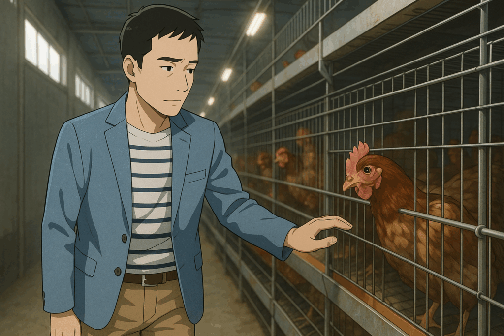 しかし、20代の中盤頃から、このケージ飼いというシステム自体に疑問を感じ始めました。工場のような場所で鶏を飼っていたため、「鶏を飼っている」という感覚が薄れ、鶏たちが道具のように感じられました。さらに、鶏たちがストレスから殺し合い、死んでいく様子を見るうちに、「これをずっと続けていくのはどうなのだろう」と、漠然とした違和感が芽生え始めました。