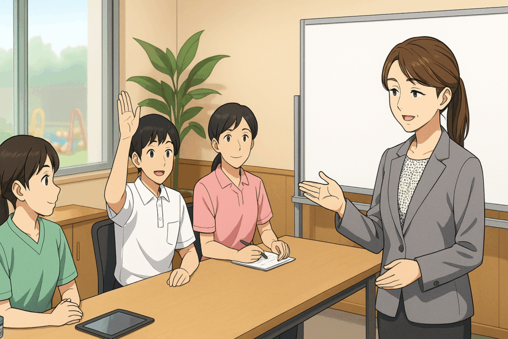 この合言葉を支えているのが、「スタッフファースト」の考え方です。介護という仕事には大変な面も多いため、創業当初からスタッフが安心して働ける環境づくりに力を注いできました。具体的には、年に一度の10日間の長期休暇制度や、会社補助付きの温かい昼食の提供など、福利厚生を充実させています。また、女性スタッフが多く子育て世代も多いことから、託児所の併設、半日有給制度の導入、従来は小学校就学前までとしていた夜勤免除制度を小学校6年生までに延長するなど、スタッフの声に耳を傾け、協力体制のもとで、より働きやすい制度へと常に改善を重ねています。さらに、資格取得費用や更新費用の補助に加え、月2回程度の社内研修を実施し、スタッフのスキルアップと成長を支援しています。