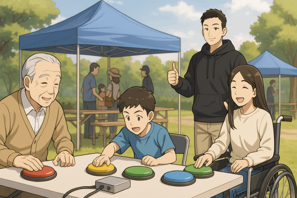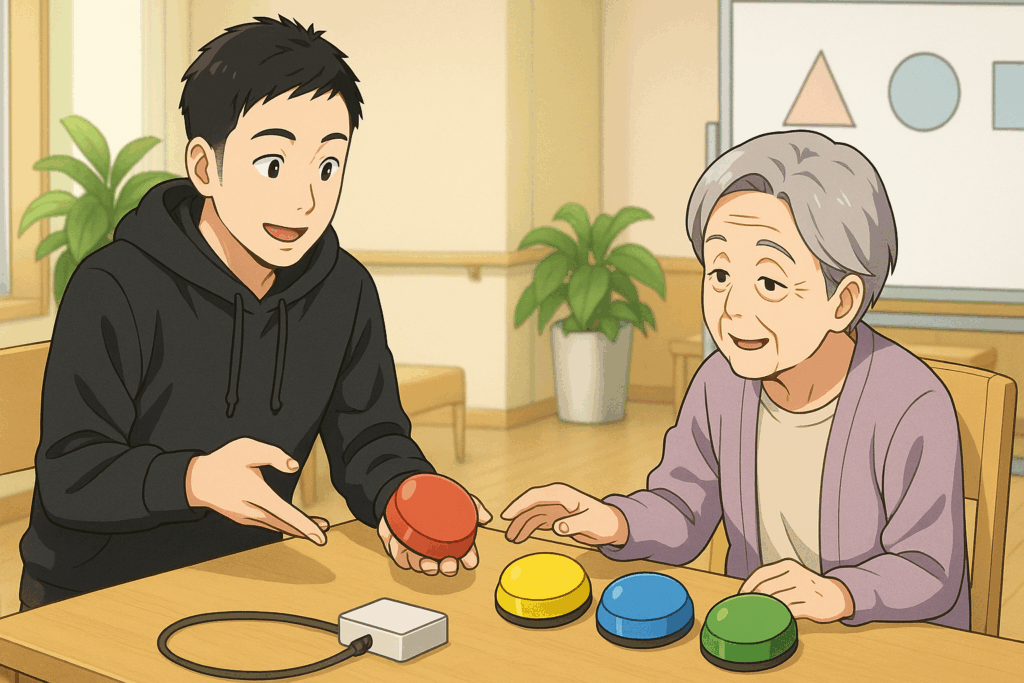 操作に必要なのは、色分けされた手のひらサイズの大きなボタン4つだけ。キーボードや複雑なコントローラーが苦手な高齢者でも使いやすい設計にしました。